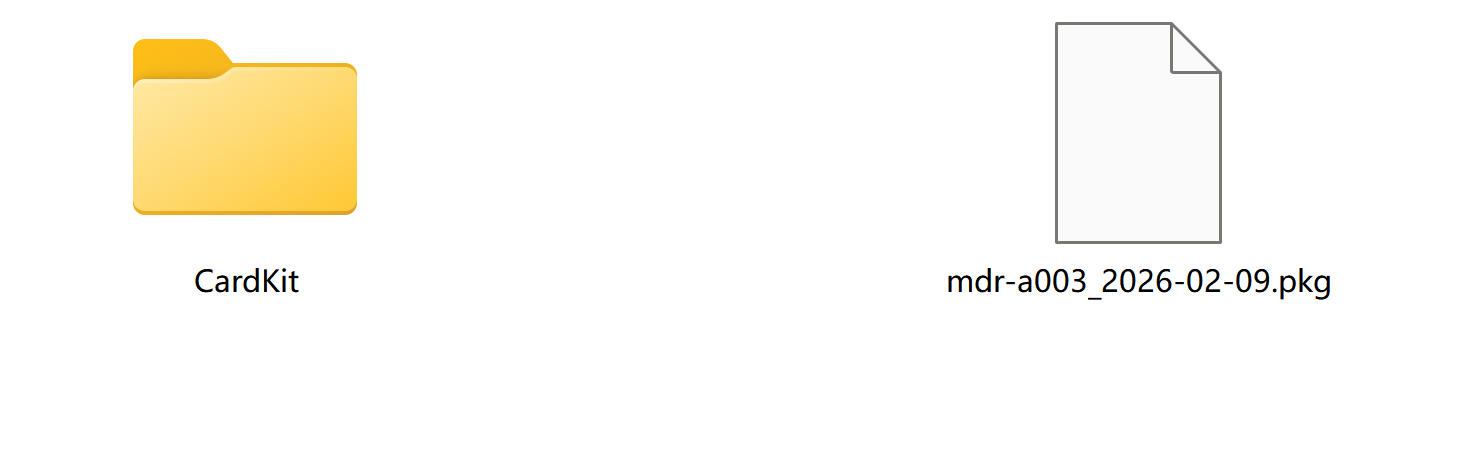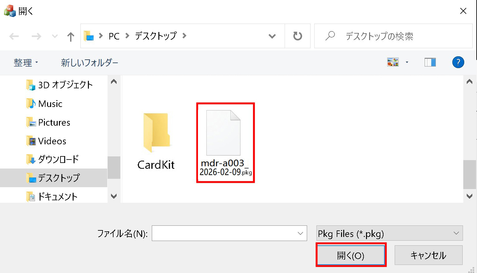 5.画⾯の右上の「Open」ボタンをクリックし、FWバージョンアップファイル「mdr-a003_2026-02-09.pkg」を選択してください。