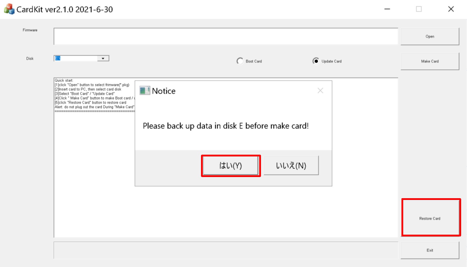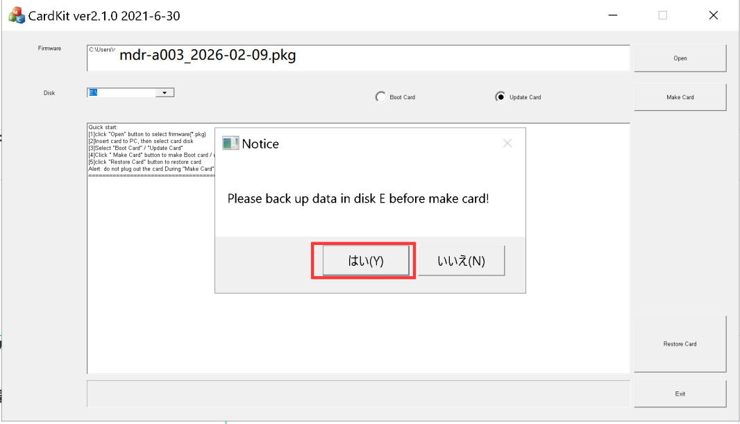 6.「Make Card」ボタンをクリックして、確認画面が表示されますのでよろしければ[ はい ] ボタンを押し、microSDカードにFWバージョンアップファイルの保存を開始します。