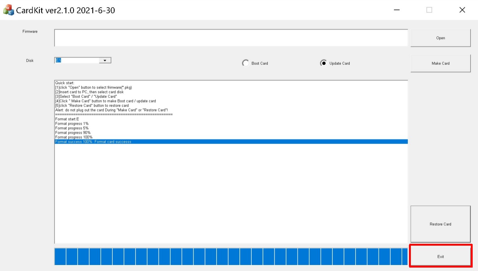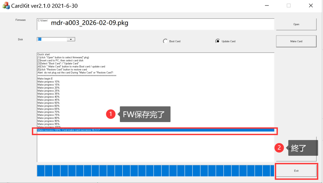 7.保存完了後(100%)、「Exit」ボタンをクリックして「CardKit.exe」ソフトを終了し、microSDカードをパソコンから取り外してください。