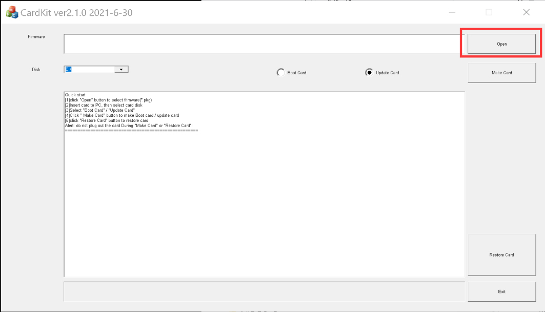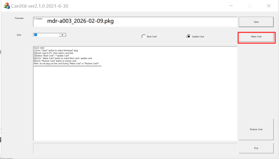 10.使用したmicroSDカードは必ずパソコンでフォーマットしてください。microSDカードをパソコンに接続し、「CardKit.exe」ソフトを起動します。画面右下の「Restore Card」ボタンをクリックし、FWバージョンアップファイルを消去してください。