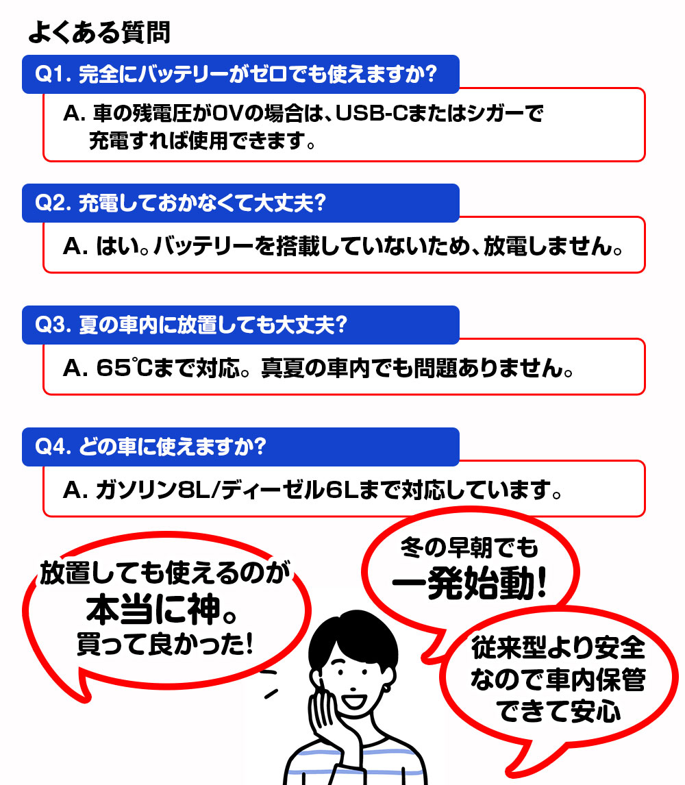 従来のジャンプスターターでは0℃以下で性能低下が大きいですが、本製品は極寒地テスト済みですので使用可能です。