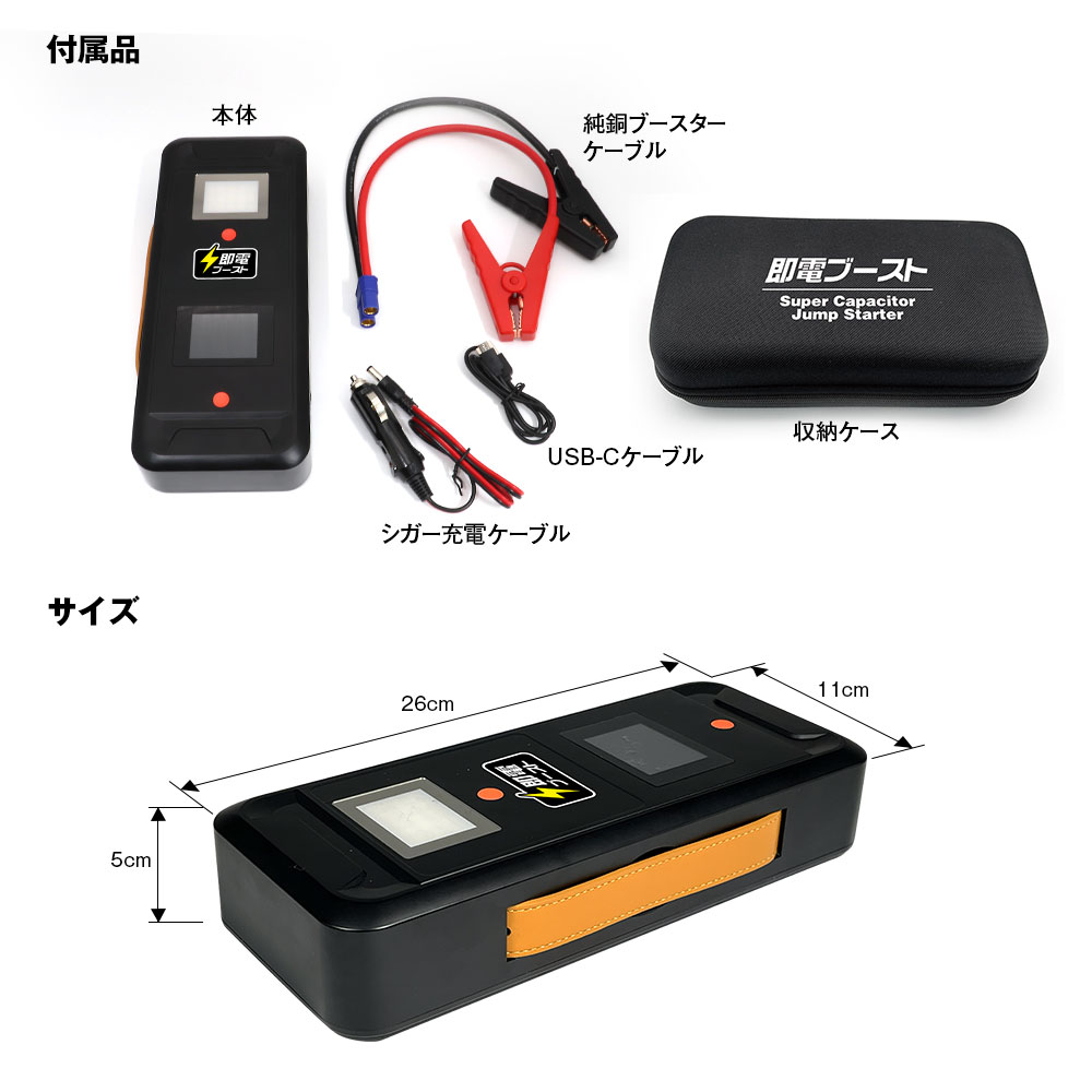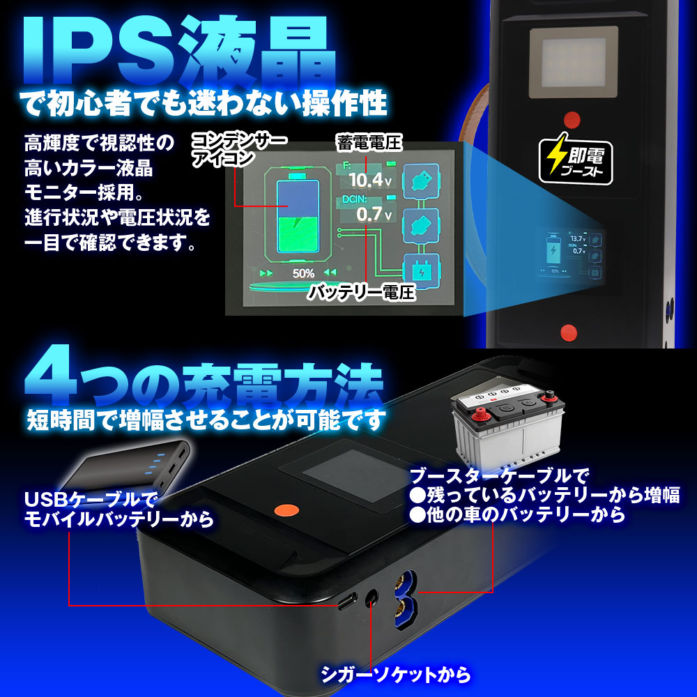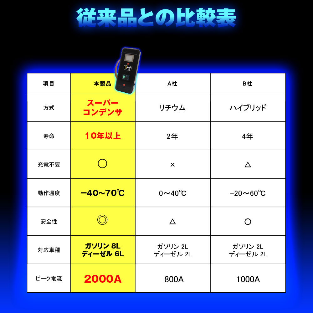 500F×5個=合計2500Fのスーパーコンデンサを搭載。エンジンスタートに必要なピーク電流が最大2000Aに対応。