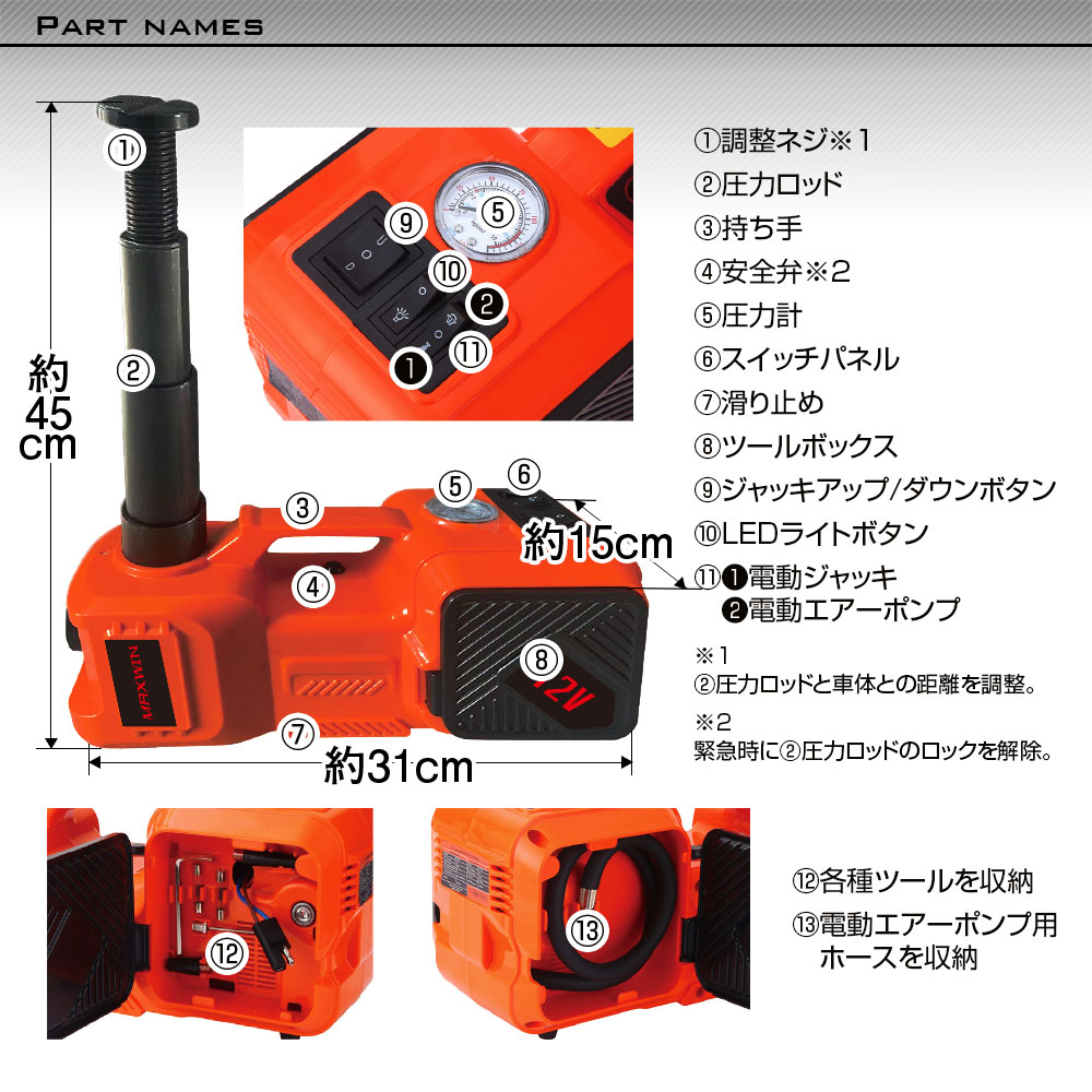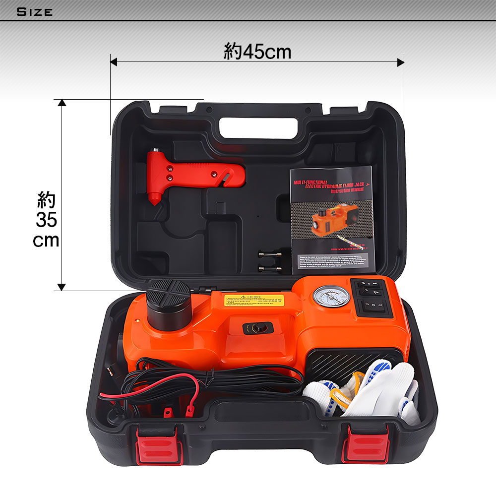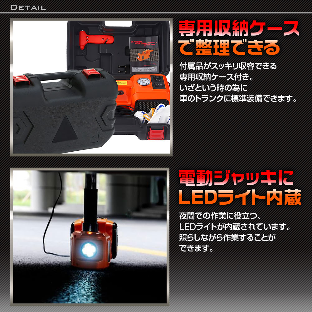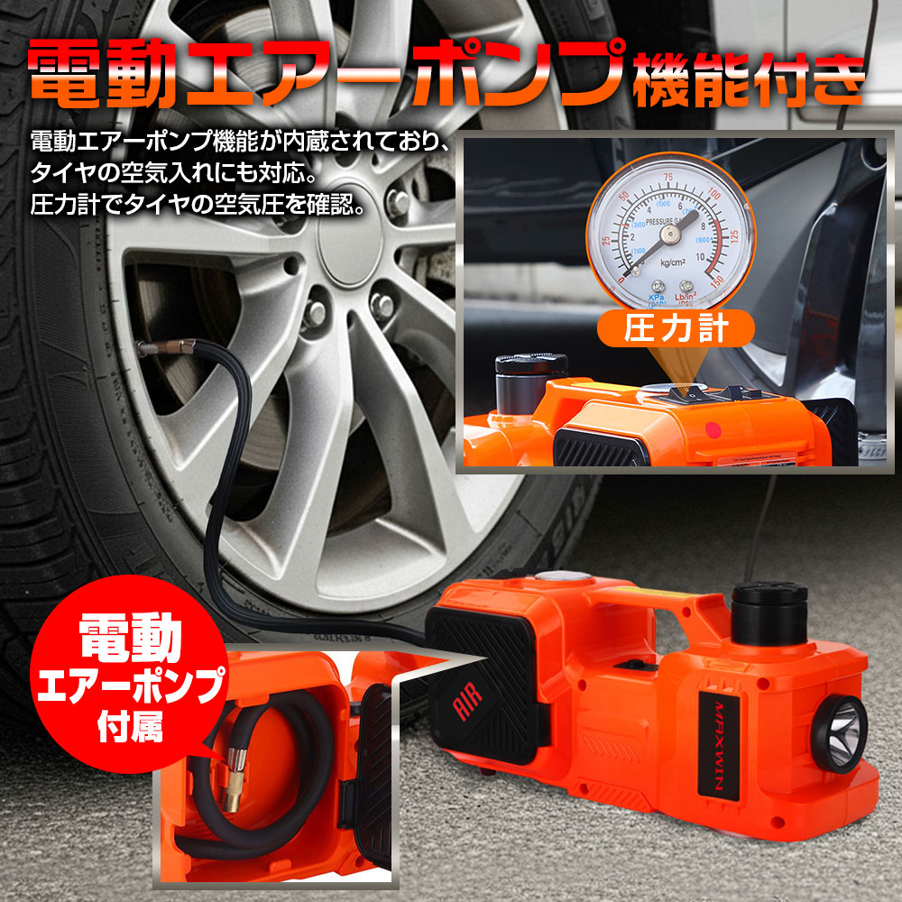最大5トンまでの車両を最低位155mmから最高位450mmまでジャッキアップ可能です。シンプルな設計なので専門知識が無くても簡単に使える電動ジャッキです!LEDライト内蔵なので夜間で使用できます。電動エアーポンプ機能付きでタイヤの空気圧補充にも対応