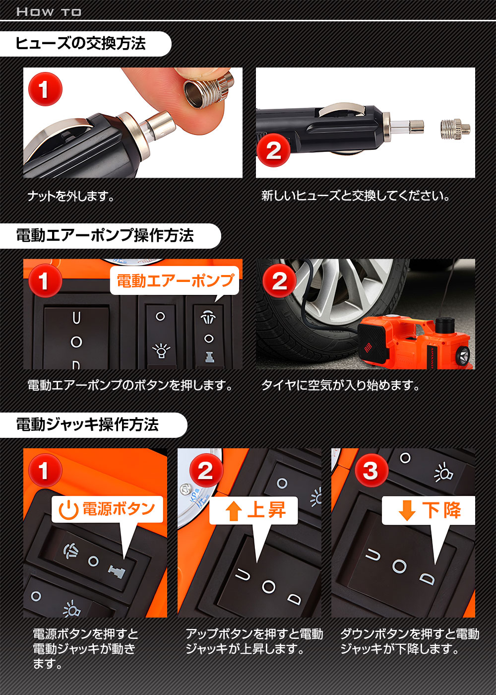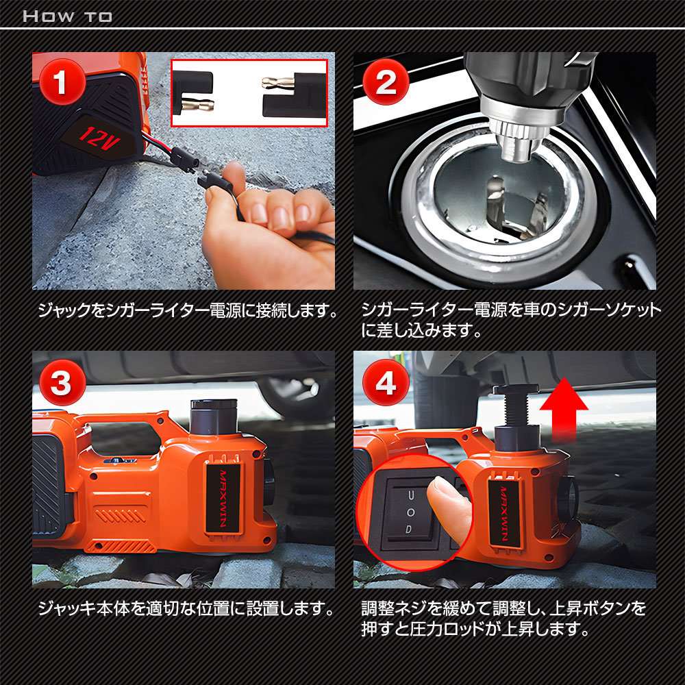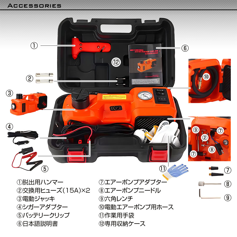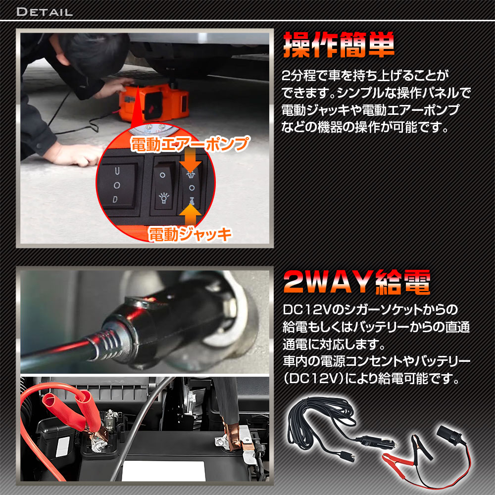 最大5トンまでの車両を最低位155mmから最高位450mmまでジャッキアップ可能です。シンプルな設計なので専門知識が無くても簡単に使える電動ジャッキです!LEDライト内蔵なので夜間で使用できます。電動エアーポンプ機能付きでタイヤの空気圧補充にも対応