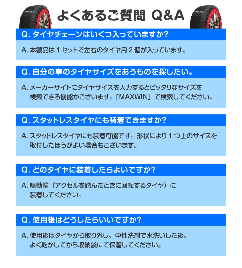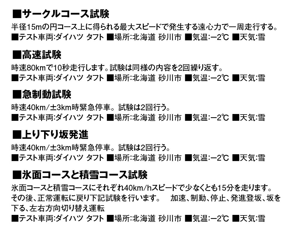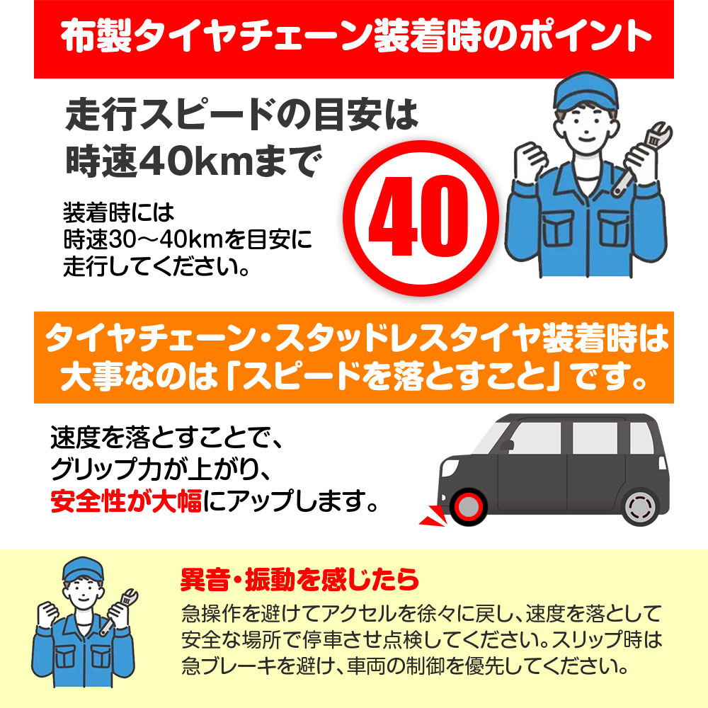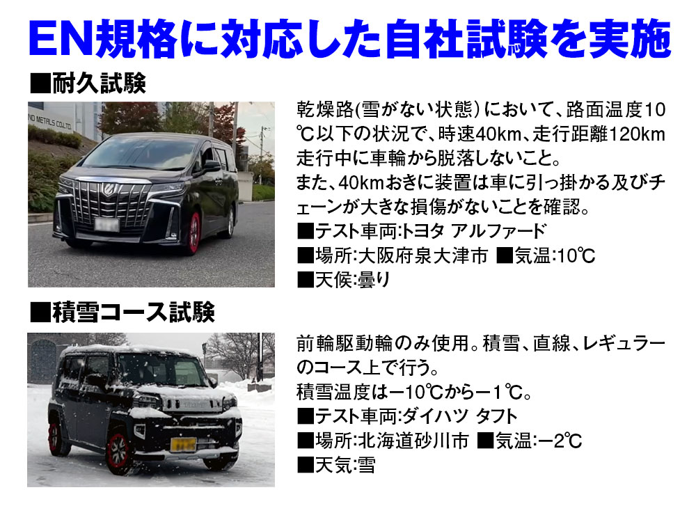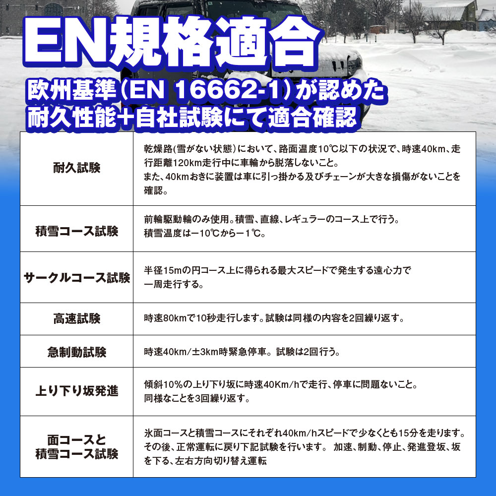 ※個別の高速道路などのチェーン規制では現場の判断で不適合と判定される場合がありますのでご注意ください。