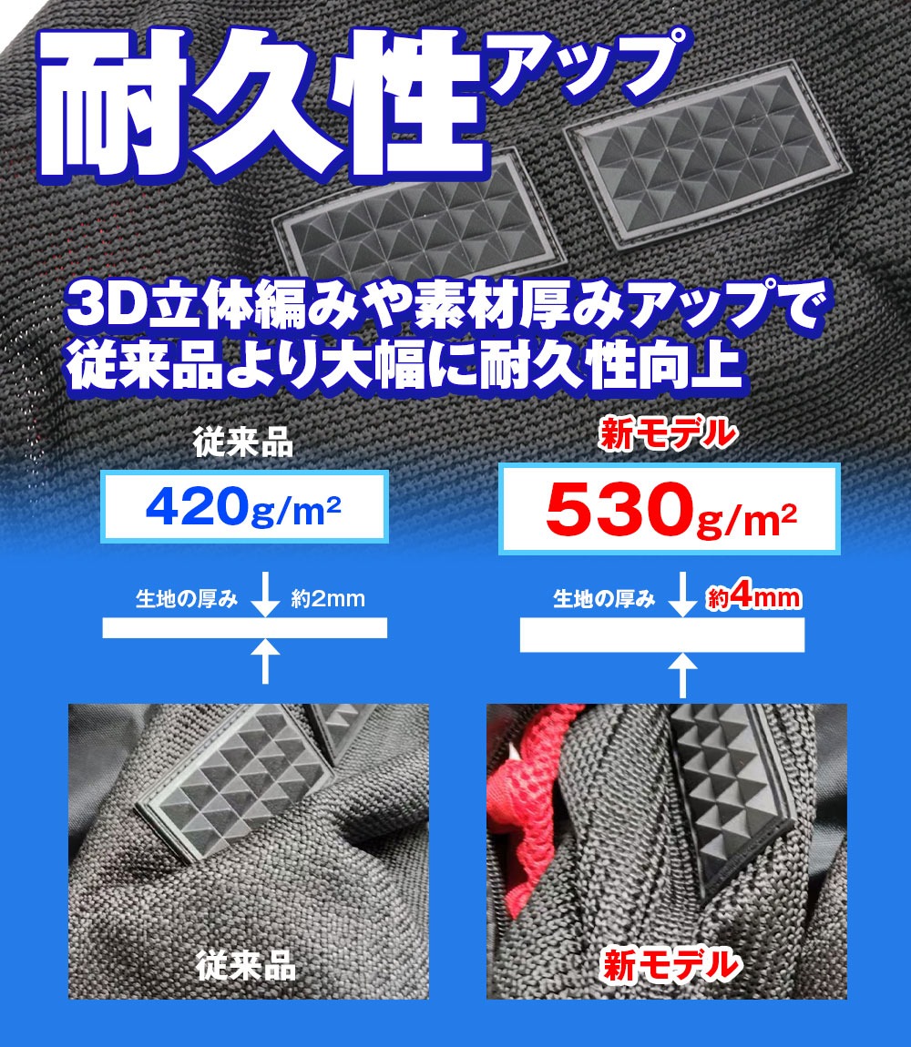 また本体生地をポリエステルから高強度ポリプロピレンに変更。生地の厚さも、前モデルより約2倍となったので