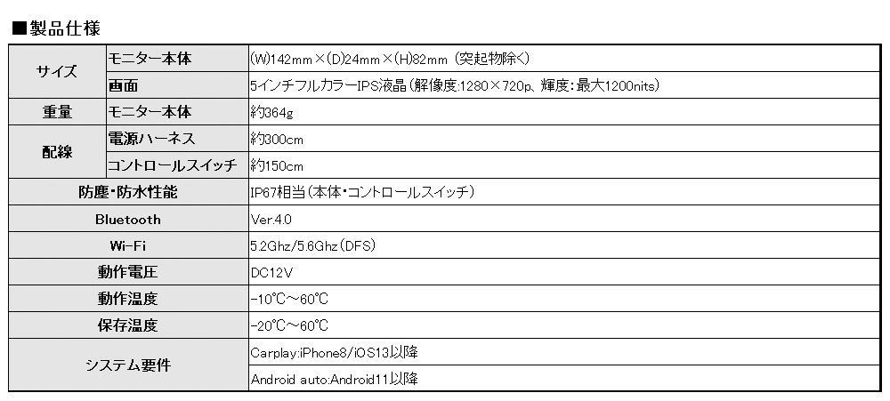 | システム要件 | Carplay:iPhone8/iOS13以降 | ||||||