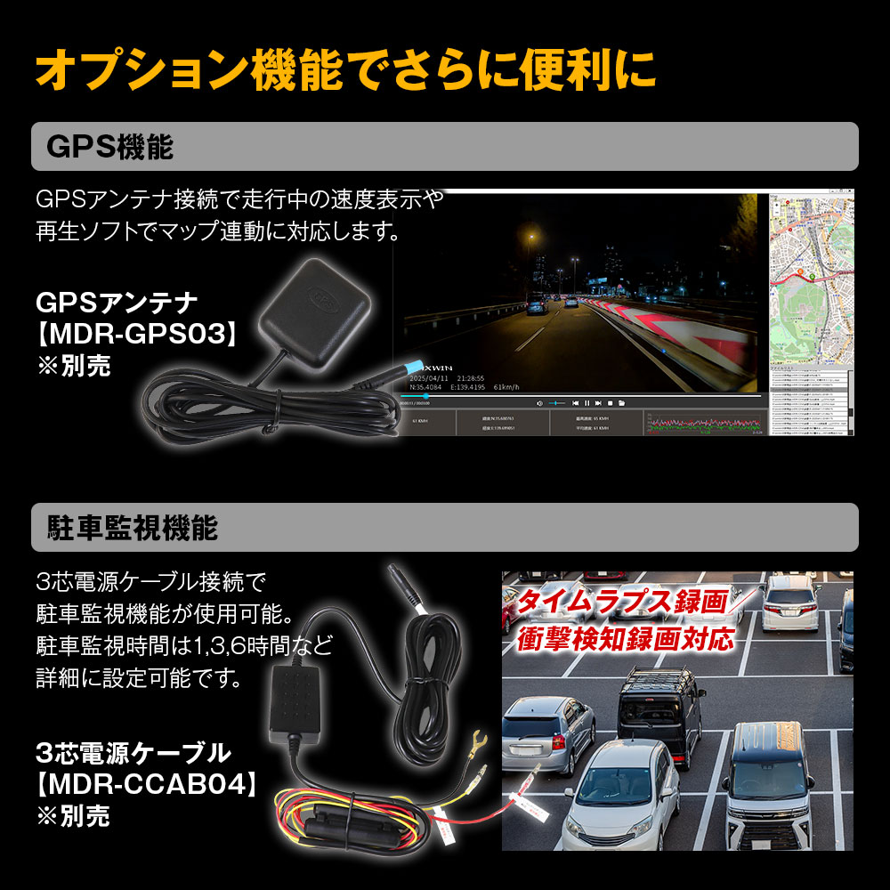別売の3芯電源ケーブル(MDR-CCAB04)接続で駐車監視機能が使用できます。タイムラプス/衝撃検知録画に対応。