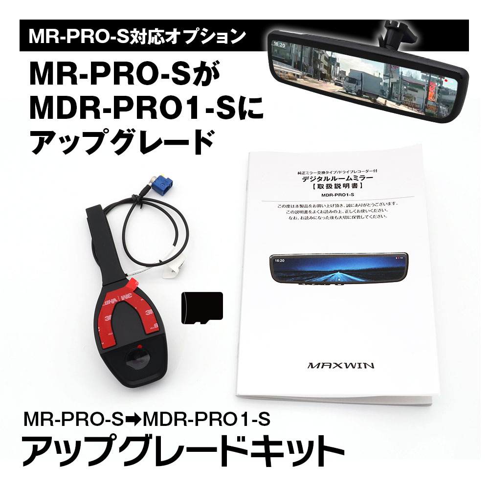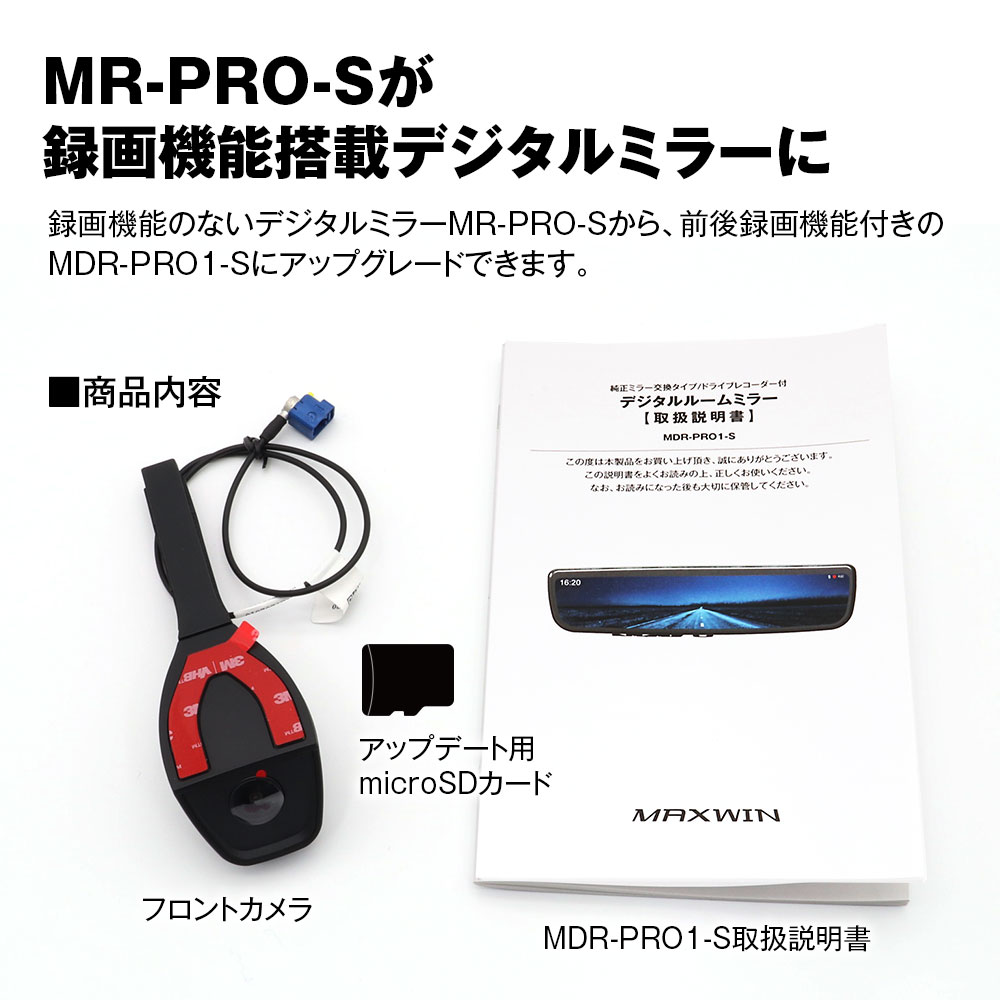 録画機能のないデジタルミラーMR-PRO-Sから、前後録画機能付きのMDR-PRO1-Sにアップグレードができるフロントカメラとファームウェアアップデート用microSDカードのセットです。