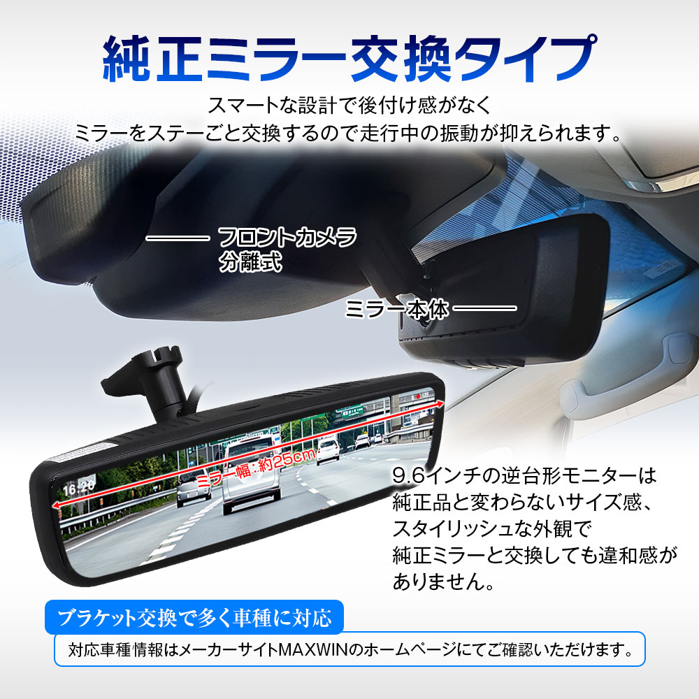 9.6インチの逆台形モニターはミラー幅:約25cmと純正品と変わらないサイズ感、スタイリッシュな外観で純正ミラーと交換しても違和感がありません。