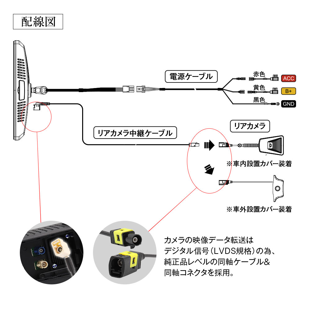 カメラの映像データ転送はデジタル信号(LVDS規格)の為、純正品レベルの同軸ケーブル&同軸コネクタを採用。