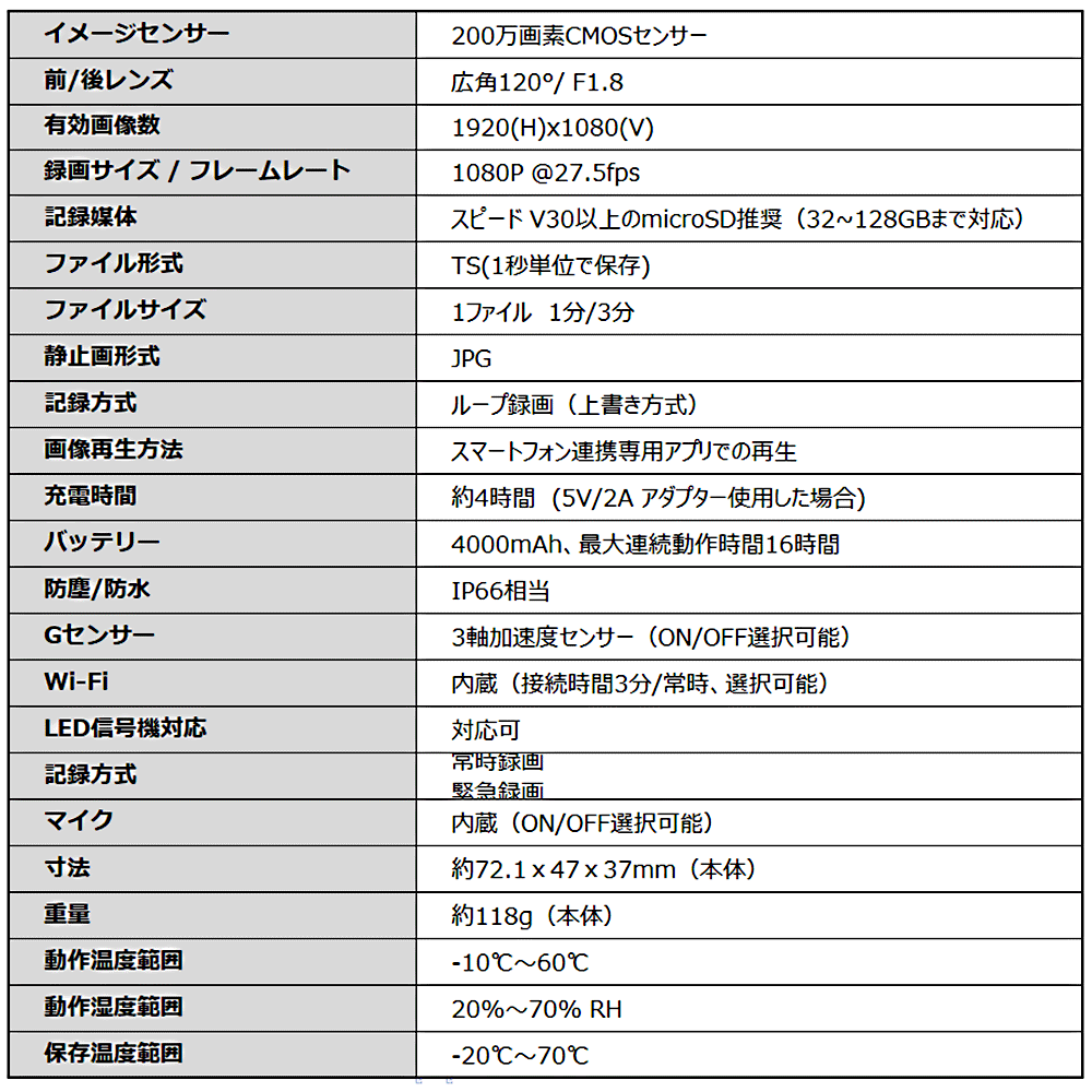 搭載したセンサーで転倒や衝撃を検知した場合、自動的に録画中のファイルをロックするので