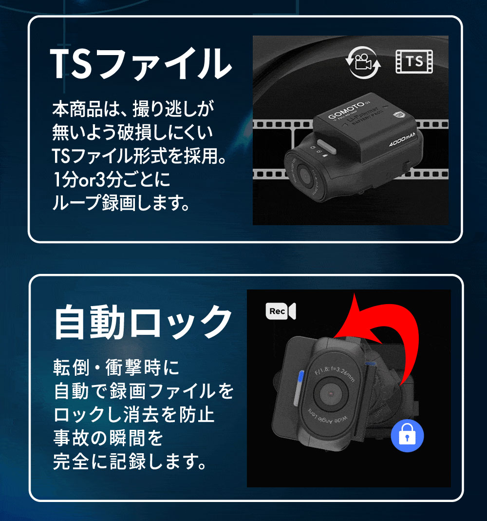 搭載したセンサーで転倒や衝撃を検知した場合、自動的に録画中のファイルをロックし、緊急録画専用フォルダに保存します。