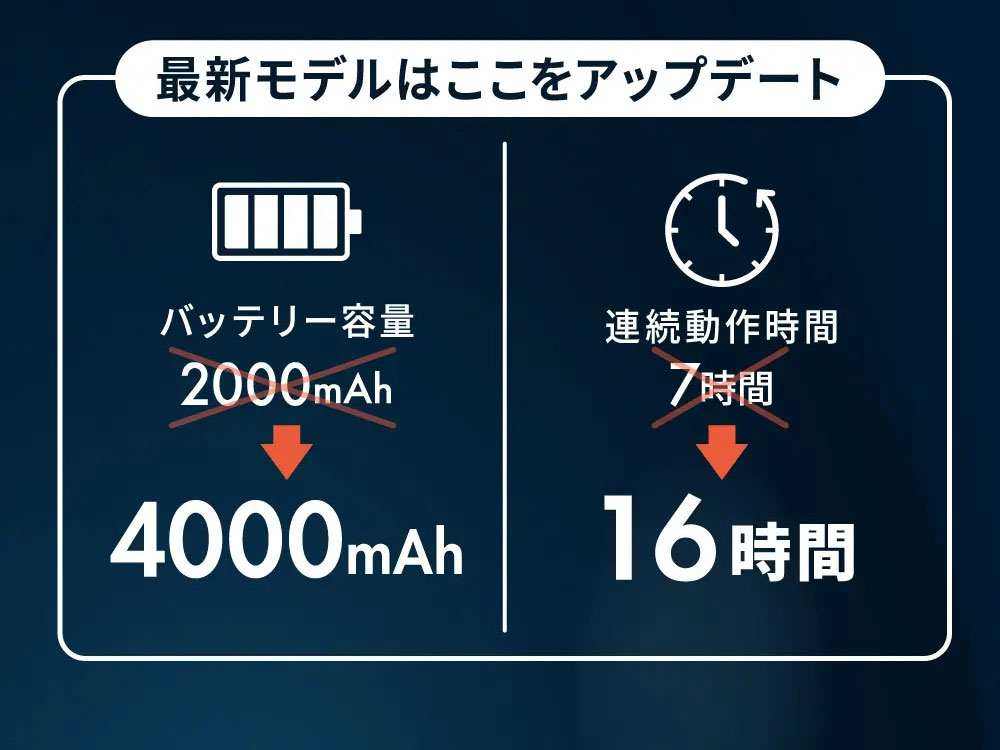 満充電時、最大約16時間の連続録画に対応する大容量バッテリー(4000mAh)内蔵。