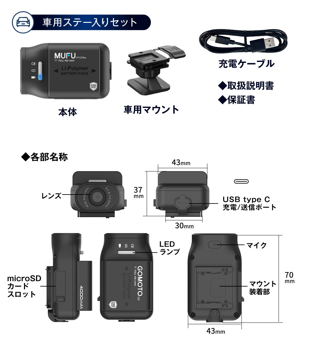 ドラレコ本体×1、USBケーブル(Type-C)×1、ボールジョイントマウント×1(MF-OP07)、取扱説明書×1、保証カード×1、取付説明書×1
