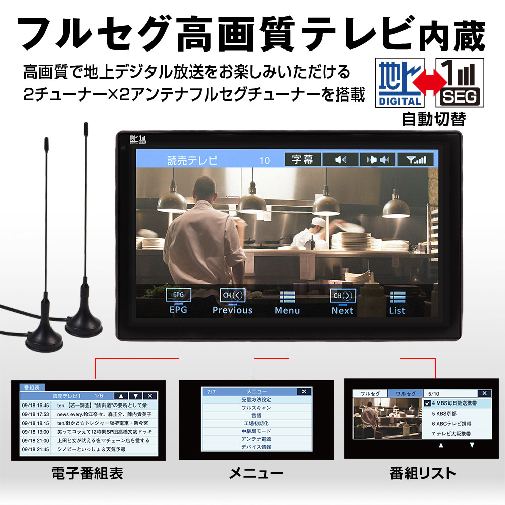 2チューナー×2アンテナの地デジチューナを内蔵しています。受信状況によりフルセグ放送⇔ワンセグ放送の自動切替機能搭載しています。ワンセグ・フルセグに対応なので幅広いエリアでテレビをお楽しみいただけます。