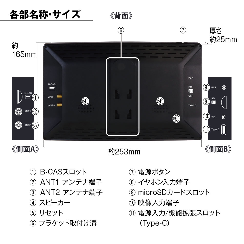 本体×1、シガーアダプター×1、映像入力ケーブル×1、電源ケーブル(入力出力用)×1、miniB-CASカード×1、ロッドアンテナ×2、取付スタンド×2、取付キット(プレート・両面テープ)